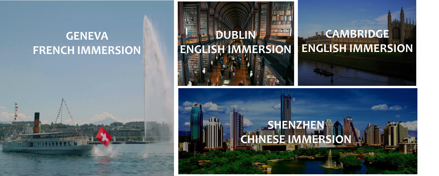 Cambridge and Dublin for English, Geneva for French, and Shenzhen